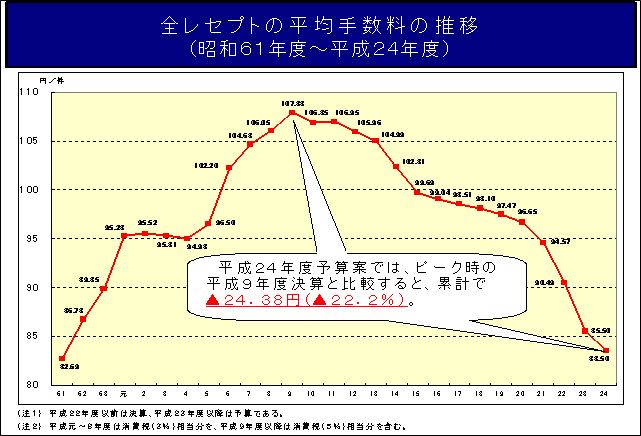 具体的には、平成24年度予算案では、支出より手数料収入以外の収入及び積立預金からの受入金を減じた手数料収入で賄われる支出をレセプト件数で除する方法により、全レセプトの平均手数料を算定すると、83.50円/件となります(参考1)。