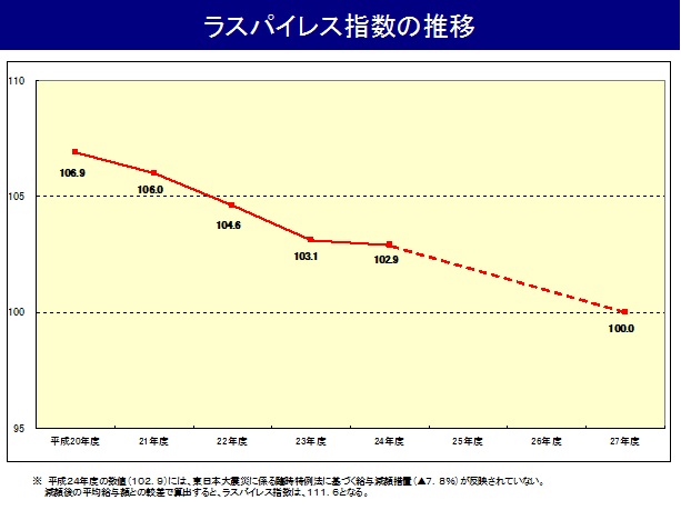 国家公務員の給与水準と比較したラスパイレス指数については、平成20(2008)年度においては106.9程度であったものが、平成24年度においては102.9(同年度から2年間に限り給与の減額が行われた国家公務員の給与水準と比較すると111.6)程度に低下しており、平成27年度においておおむね100となるよう、更に努力を行っているところです。