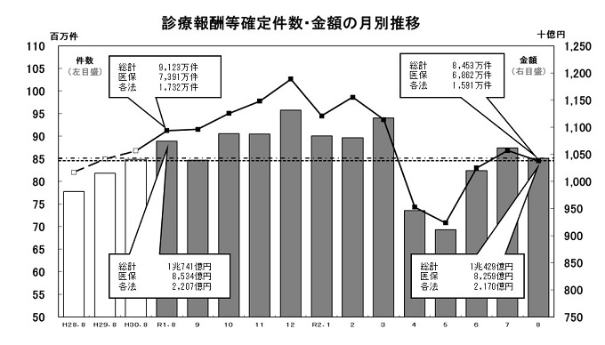 令和2年8月診療分の確定件数は総計で8,453万件であり、対前年同月伸び率では、総計は▲7.3%、医療保険分は▲7.2%、各法分は▲8.1%となっています。