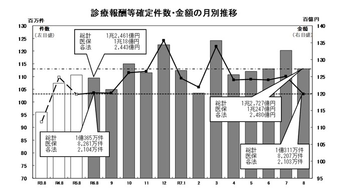 令和7年8月診療分の確定件数は総計で1億311万件であり、対前年同月伸び率では、総計は▲0.5%、医療保険分は▲0.6%、各法分は▲0.05%となっています。