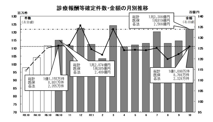 令和8年1月5日 令和7年10月診療分は対前年同月伸び率で 確定件数 0.5%減少、確定金額 4.0 %増加